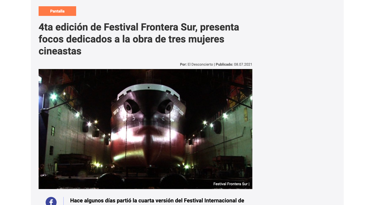 Noticia 4ta edición de Festival Frontera Sur, presenta focos dedicados a la obra de tres mujeres cineastas 22 / 07 / 2021